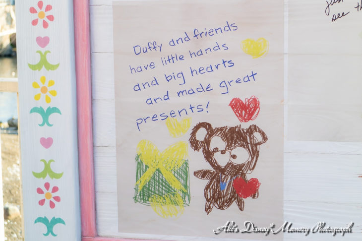 看板の中央にはダッフィーたちが贈り物を作ったり飾り付けたりしている様子のスナップ写真。