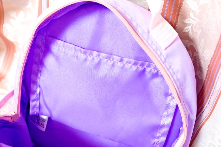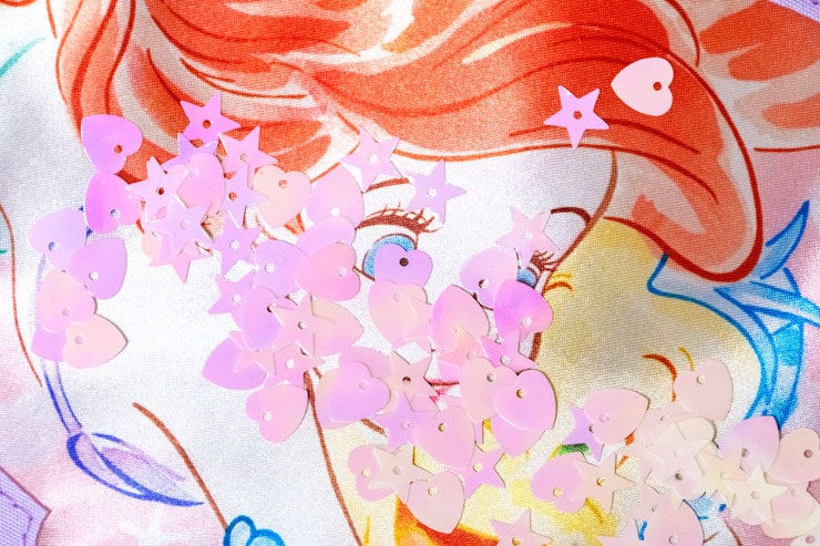 お気づきの方もいらっしゃるかもしれませんが、リュック全面のイラスト部分はハートや星のスパンコールが入っています。