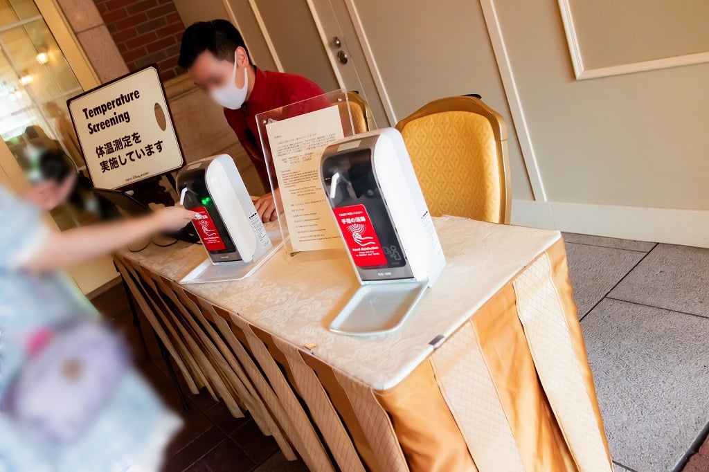 エントランス前には非接触のアルコールと検温があり、キャストさんが1人ずつチェックされていました。アルコールが非接触なのすごくうれしいです!あの、プシュッてやるために全員が必ず同じ場所を触るの、とっても違和感があるんですよね・・。