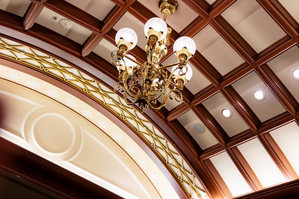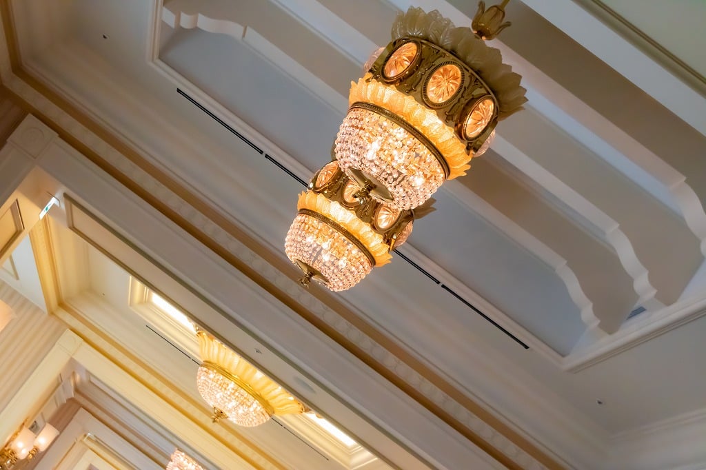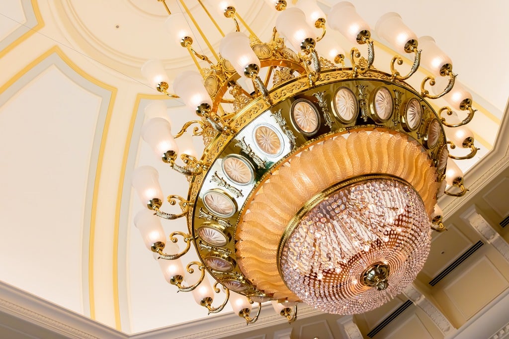 そして見上げるとこの光景。ブラウンの建具とゴールドの照明が美しい!素晴らしいコントラストですね。このシャンデリアもどうやったら持って帰れるか真剣に考えました。まず部品ごとに分解して・・。