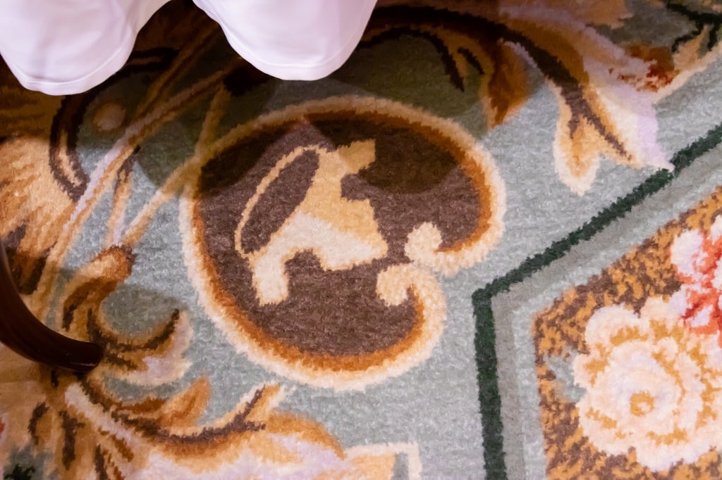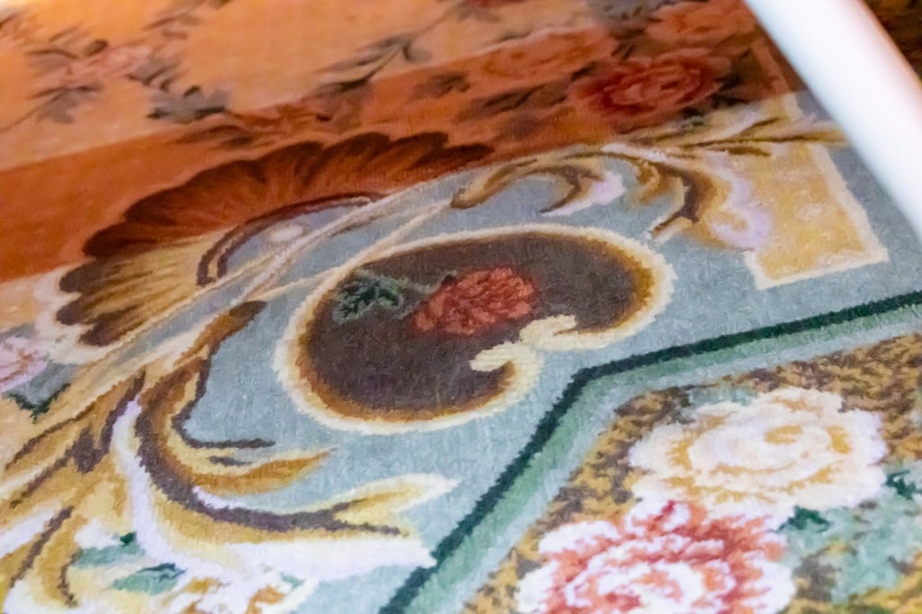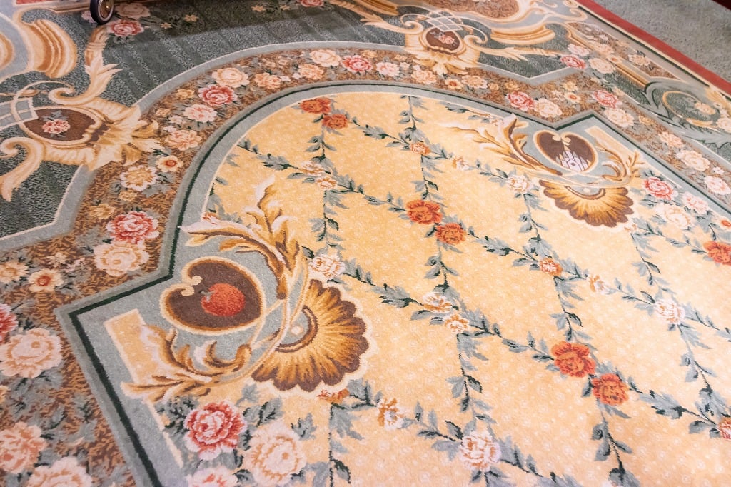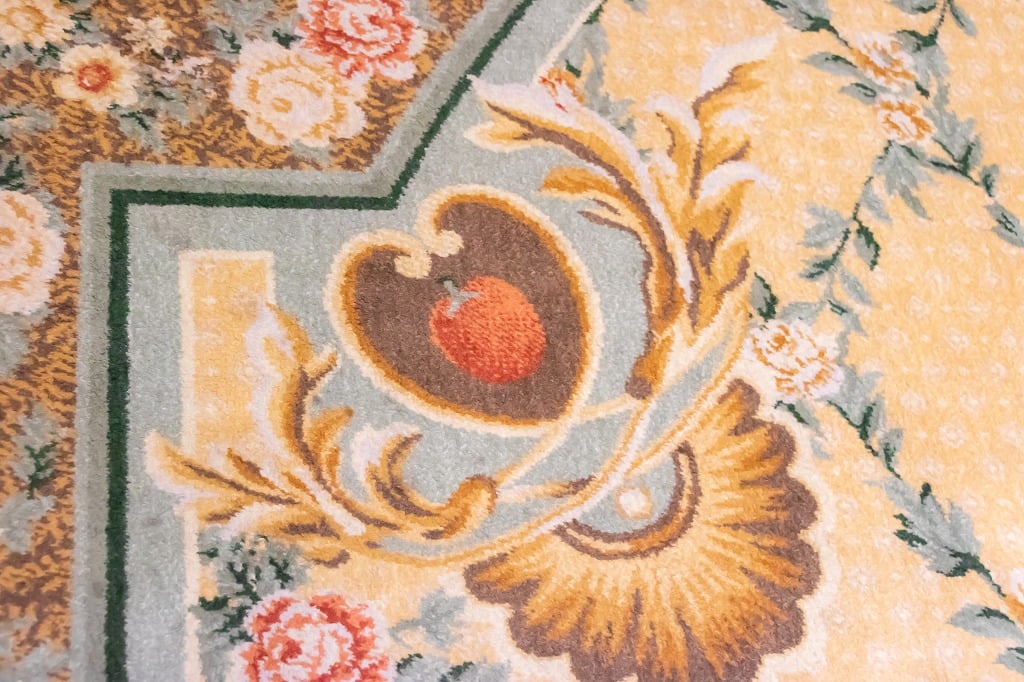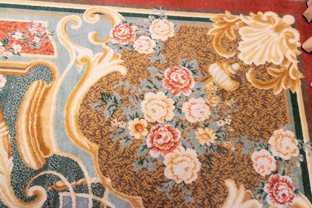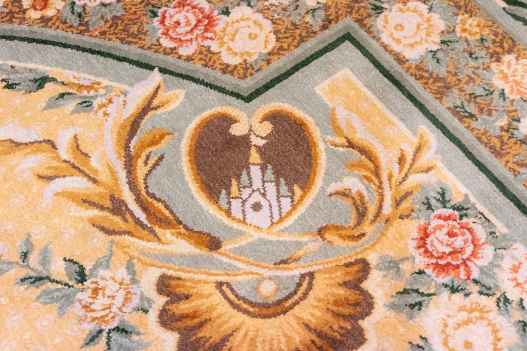 お次はカーペット。カーペットはあたたかみのあるかわいらしい色合いです。照明の色で黄色くなってる部分もあるんですけど、カーペット自体が全体的に暖色系です。レリーフや薔薇のモチーフの絵柄がとってもキュート!