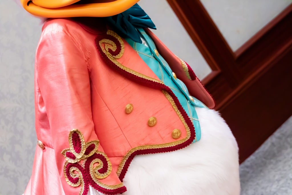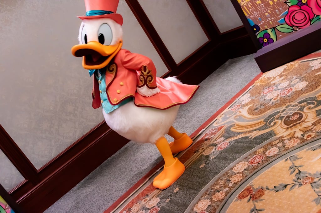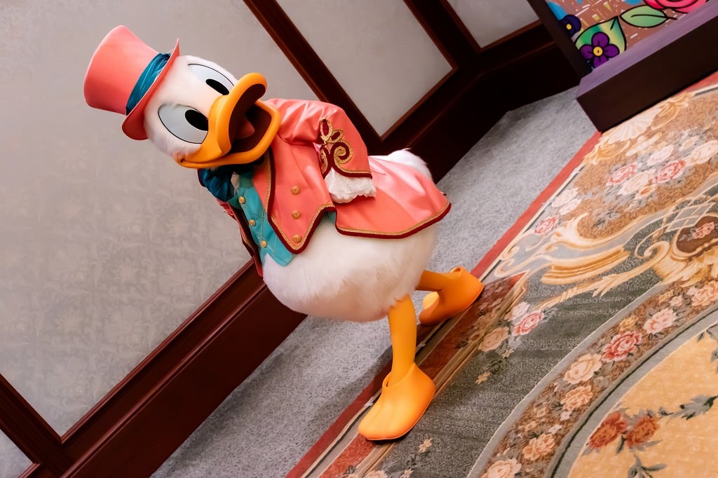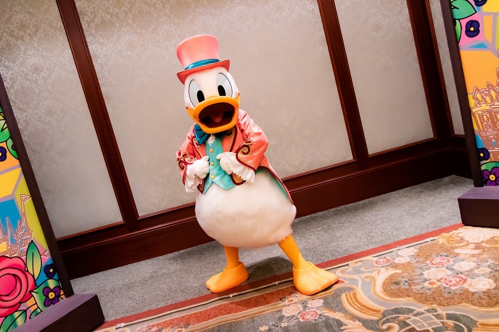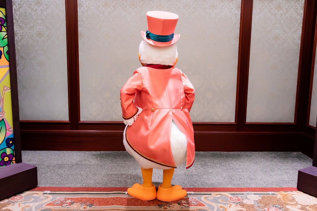ディズニーランドホテルの衣装に身を包んだドナルド、かわいすぎる・・!サーモンピンク×ミントグリーンという私得すぎる色合いにシルクハット。たまらんかわいさです。