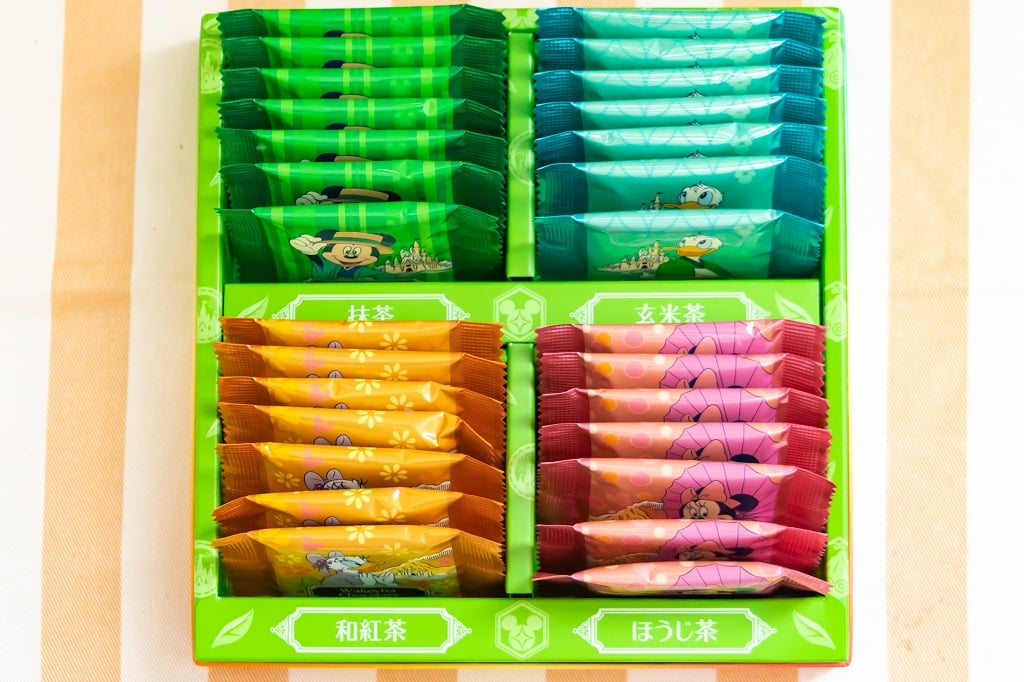 中は4つに仕切られていて、ミッキーが抹茶味、ドナルドが玄米茶味、デイジーが和紅茶味、ミニーがほうじ茶味でございます。それぞれ7枚ずつ入っていて合計28枚!