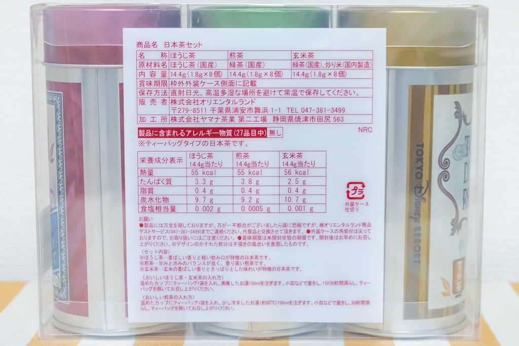 原材料表記はこんな感じです。お茶はティーバッグで、それぞれ8袋ずつ入ってるみたいですね。あっという間に飲んじゃいそう、私。日本茶でティーバッグタイプって意外と珍しいので、気軽に日本茶を楽しめるのがありがたいんですよねー!おうちに急須などがない方にもおすすめです。(つまりギフトでも贈りやすい)