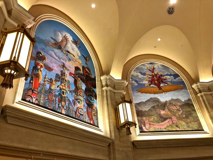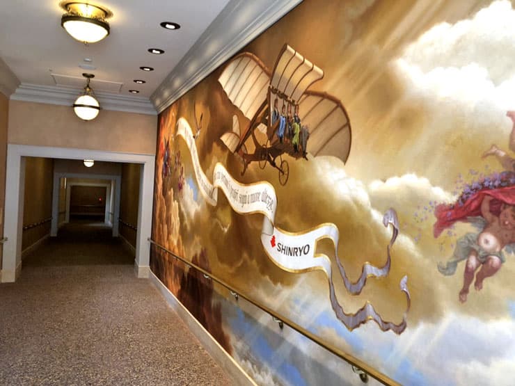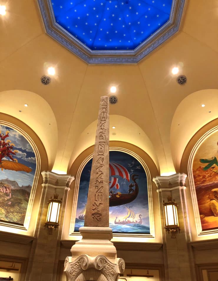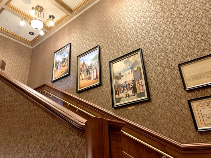 建物の中は実に美しく、海外の美術館にいるような階段には絵が飾られ、ソアリンに乗る手前のホールはミラコスタのエントランスホールのような感じでここにも世界各国の風景が絵にして飾られていました。