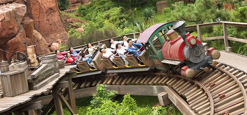 蒸気機関車に乗ってアメリカ西部を旅するアトラクションです。スピードは速くありませんが、途中暗闇の場面があります。