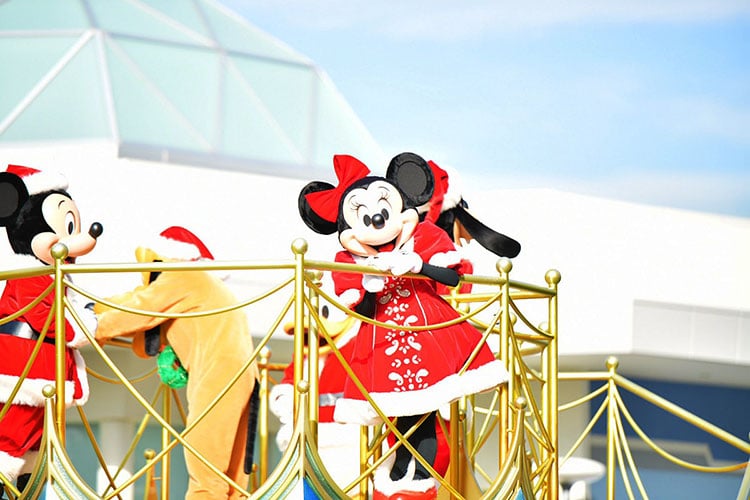 グリーティングパレードは、フロート1台でミッキー、ミニー、ドナルド、グーフィー、プルートがクリスマスコスチュームで登場!