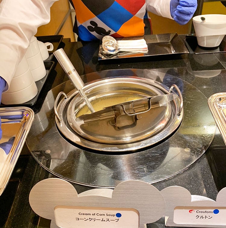 コーンクリームスープもキャストさんがカップに入れてくれ、クルトンをお好みで入れてくれます。