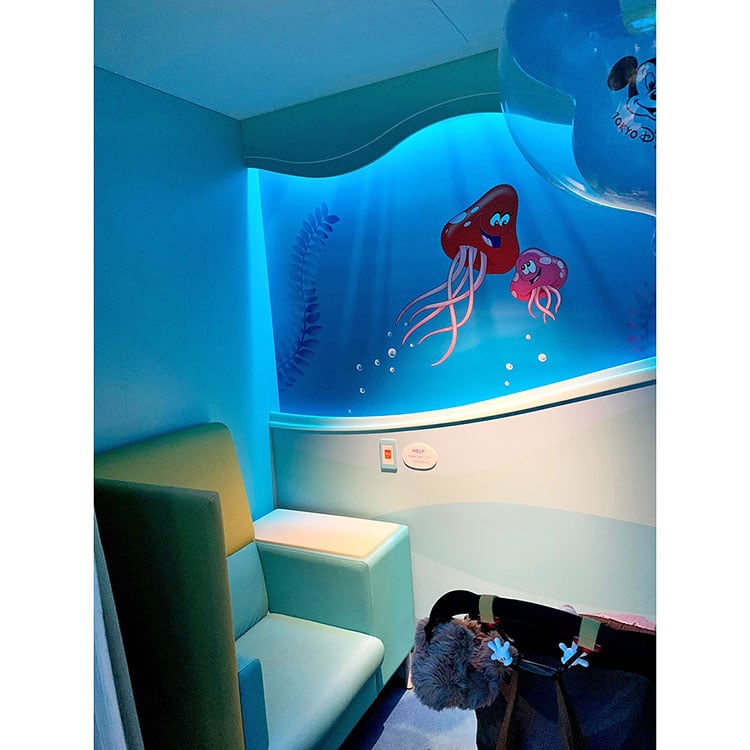 壁には水の中にいるような泡やリトル・マーメイドに出てくるキャラクター達がデザインされていて、施設の間接照明は水面を思わせるようなものになっていました。