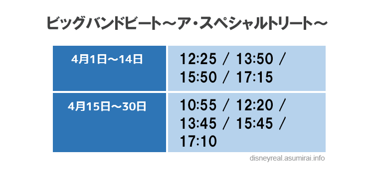 ビッグ・バンド・ビートの4月の公演スケジュールは1日4回〜5回。