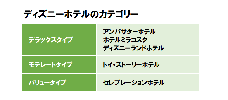 デラックスタイプがディズニーアンバサダーホテル/東京ディズニーシーホテル・ミラコスタ/東京ディズニーランドホテル。