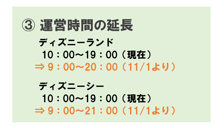 東京ディズニーランド運営時間 (現在)10:00〜19:00 ⇨ (11月1日より)9:00〜20:00