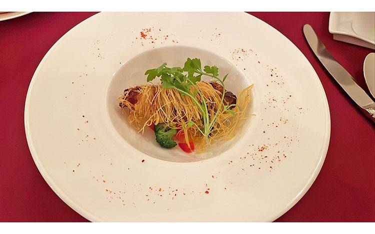 カンパチの周りにパリパリのカダイフが巻かれており、口の中でザクザクした食感と魚のふわふわ感がたまりませんでした。