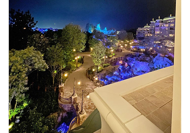ホテルのロビー奥には外に出られるバルコニーがあり、そこからはファンタジースプリング内を見ることができます。