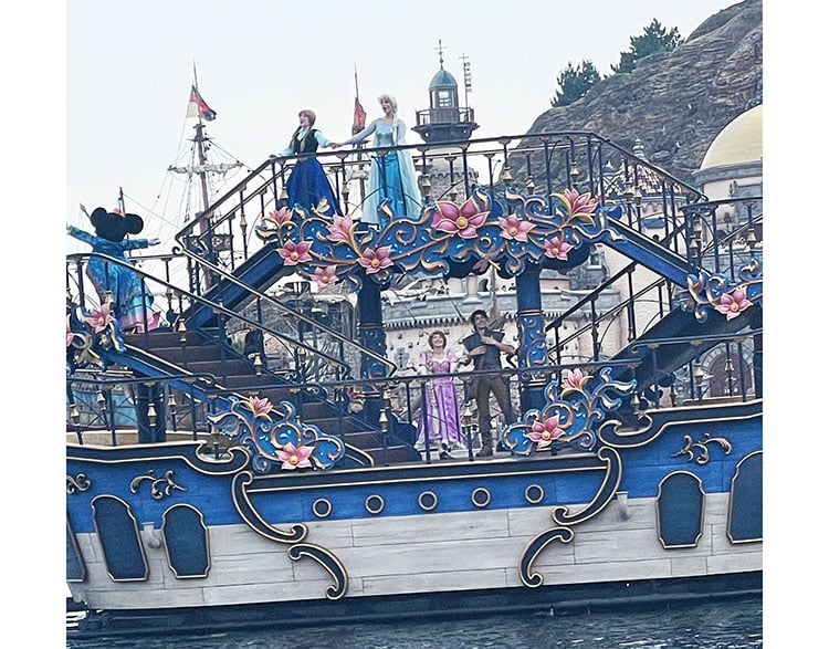 ファンタジースプリングスエリアをモチーフとした衣装を着たミッキーとミニー、更にはエリアに出てくるアニメーションから、アナ&エルサ、ピーターパン&ウェンディ、ラプンツェル&ユージーンがパージに乗って登場します!