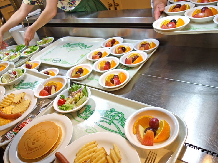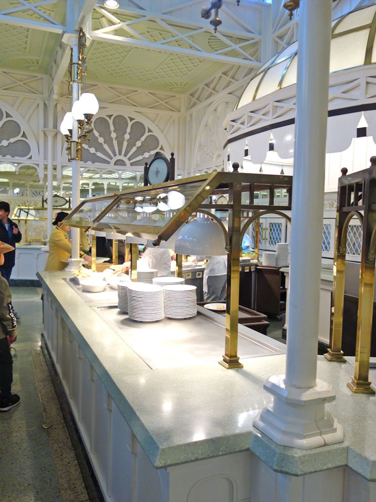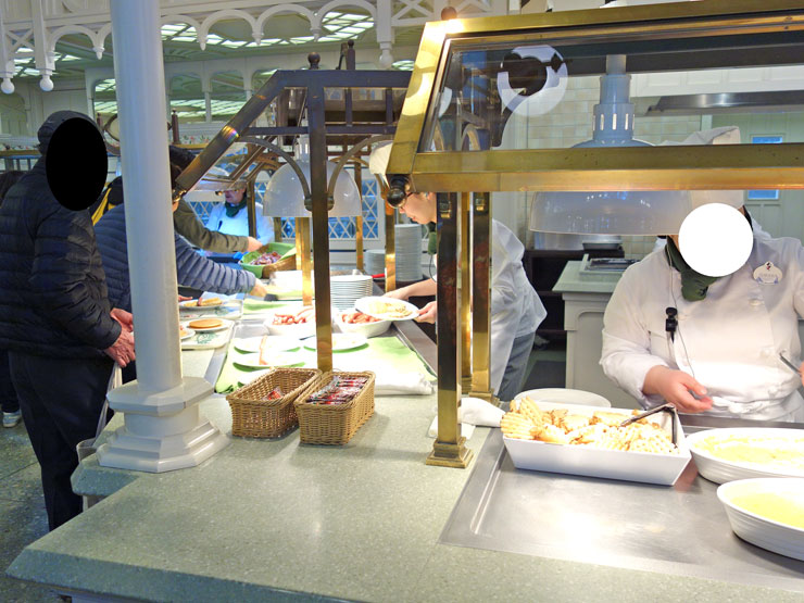 常時約50種類のメニューが並ぶブッフェ形式のレストランですが(ブッフェは、パーク開園2時間後から)、パークの開園時間から(朝食の時間帯)は、「ディズニーキャラクターブレックファスト」のみ実施しています(朝食はセットメニュー)。