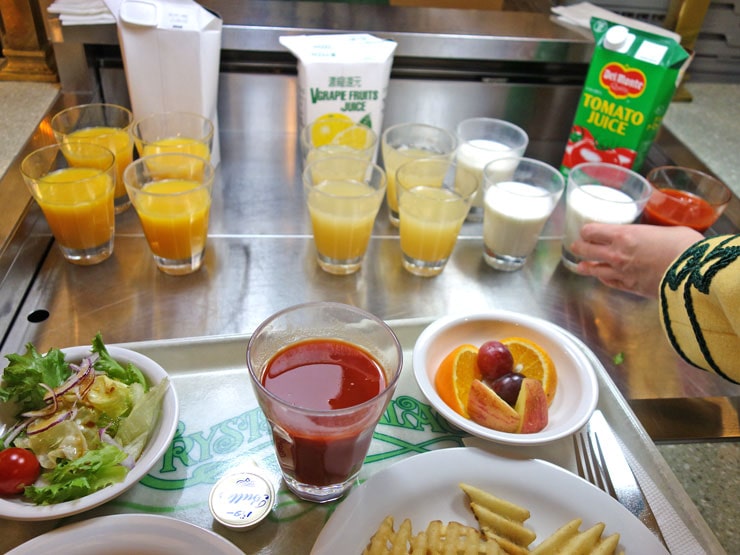 コールドドリンクを4種類(トマトジュース、ミルク、グレープフルーツジュース、オレンジジュース)の中から選び、これでトレイの上の料理が揃いました。