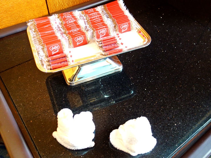 コインチョコ、ラムネ、ロータスのオリジナルカラメルビスケット『ビスコフ』などがありました。ソフトドリンクとこれらのお菓子類は、お部屋に持ち帰ることも可能です。