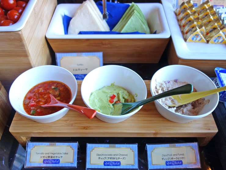 トマトと野菜のサルサ、ディップ(アボカドとチーズ)、ディップ(ポークとツナ)