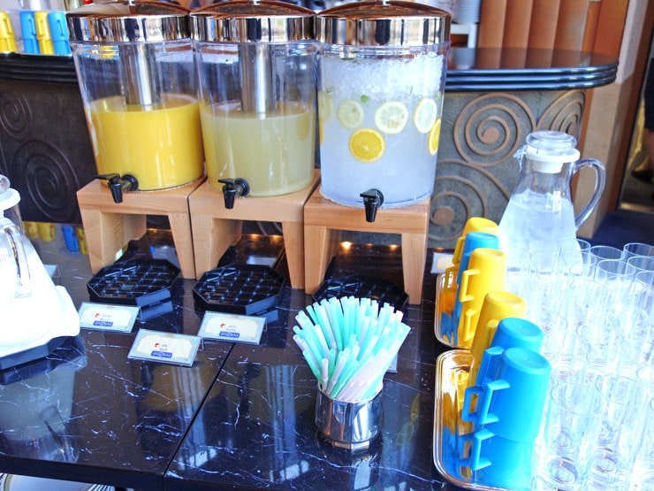 左から・・・ミルク、オレンジジュース、アップルジュース、フレーバーウォーター(シトラス&ミント)、ウォーター