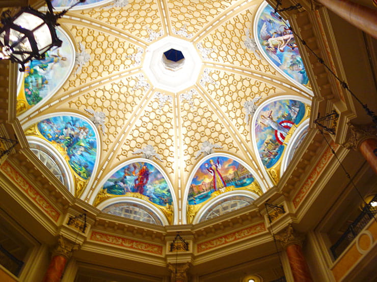 ドーム状の屋根がついたロトンダスタイルのロビーには、中央にガリオン船の彫刻が置かれています。よく見ると・・・ミッキーたちの姿も!
