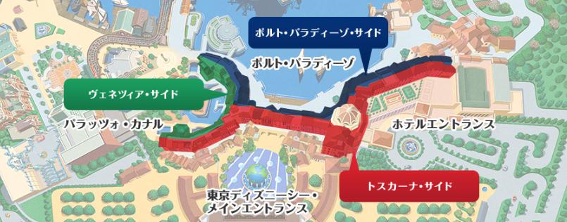 東京ディズニーシーの運河の街「パラッツォ・カナル」やホテルのスパ&プール「テルメ・ヴェネツィア」側に位置しています。水の都ヴェネツィアを思わせる美しい運河を眺めたり、ゴンドリエの陽気な声が聞こえたり・・・ロマンティックな雰囲気を感じることができます。