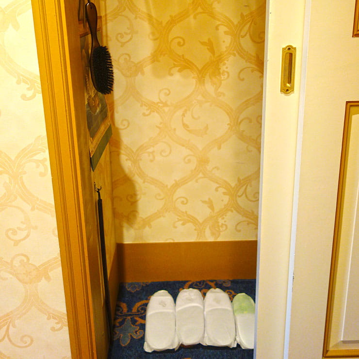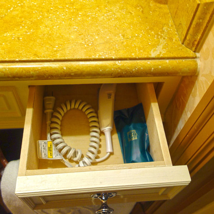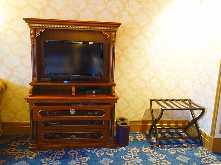 テレビ台の引き出しには、柔らかい生地で心地よい肌触りの大人用パジャマ(M、Lサイズ)が常備されています(洗濯・ドライクリーニング・プレス申込書&袋も同じ引き出しの中に)。子ども用パジャマは、チェックイン時またはサービスホットラインで申し込むとキャストが客室まで届けてくれます。