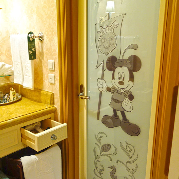そしてベッドは、レギュラーベッド2台のほかに、自由に引き出して使えるトランドルベッドが1台常設されています。エレガントなデザインのベッドスローは、人魚姿のミニーマウスがモチーフになっていますよ。かわいいですね。