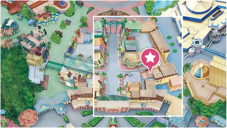 場所はエントランスからも近く、ワールドバザールの中央十字路を右へ曲がったところにあります。