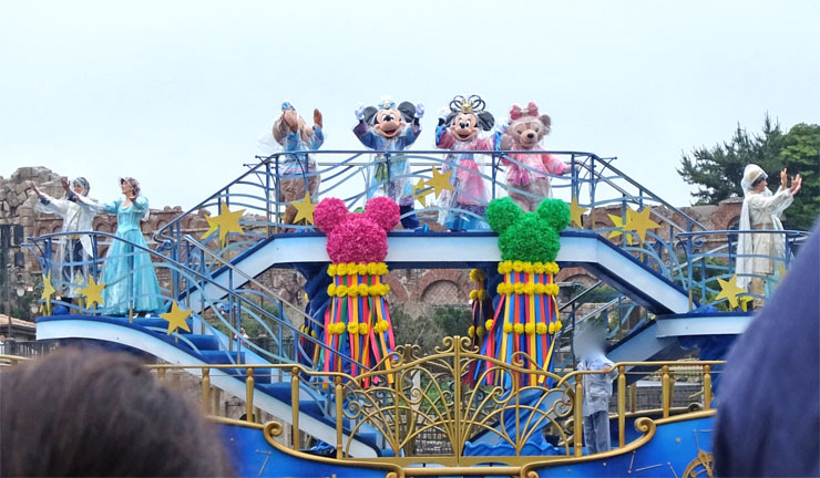 登場キャラクターは中央にミッキー、ミニー、ダッフィー、シェリーメイ、向かって左側にアリエルとエリック王子、右側にジャスミンとアラジンが乗っています。