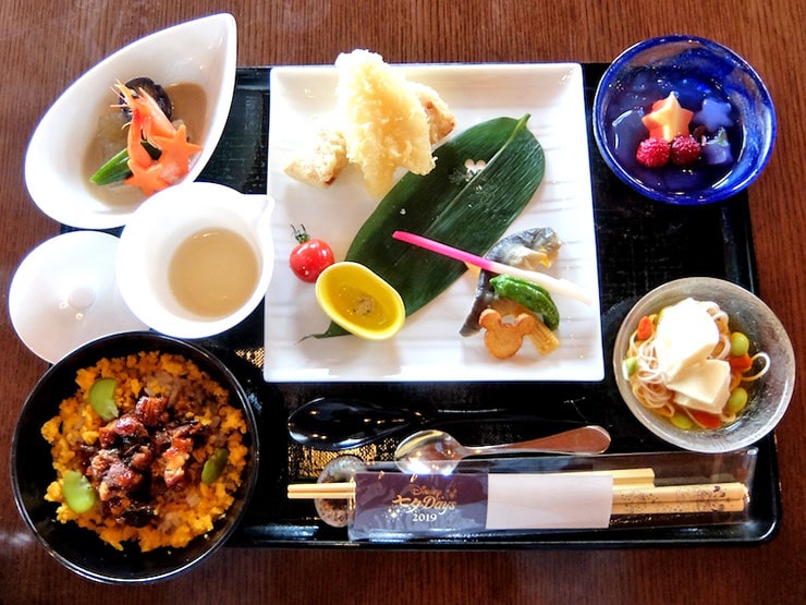 七夕膳(スーベニア箸付) 3000円 ・焼き物と揚げ物(鮎の塩焼き、キスと鶏ささみの天ぷら) ・素麺(とうもろこし豆腐、枝豆、クコの実) ・炊き合わせ(有頭海老、冬瓜、茄子、オクラ、胡麻だれ) ・鰻のまぶしご飯(玉子そぼろ、空豆、旨出汁) ・レモンゼリー、クランベリーシロップ