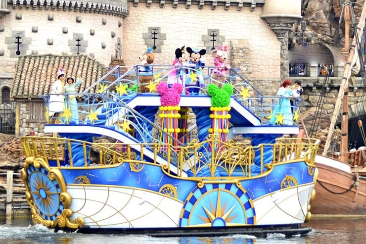 織姫と彦星のコスチュームを着たミニーとミッキーが、ダッフィー・シェリーメイ・アリエル・エリック王子・ジャスミン・アラジンと共に、七夕の装飾がされた船で登場します。