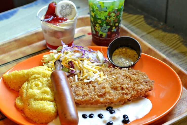 ポークカツレツ パンチェッタクリームソース、骨付ソーセージ、ターメリックライス、粒マスタードディップ、ソフトドリンク