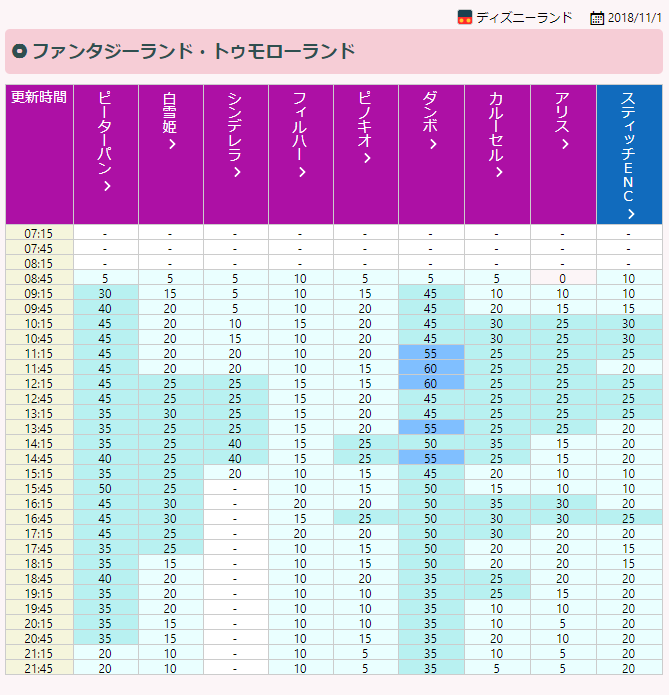 参考までに、こちらが昨年11月1日(木)のファンタジーランドの待ち時間です。