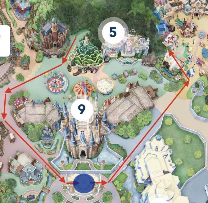 上の地図の赤い線がミッキーたちの移動ルート、青い丸がショーの場所です。