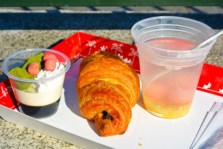 この日はホットゆずジンジャードリンクと白ごまムース&黒みつゼリー、ついでにチョコクロワッサンを買ってショー待ちの間にいただきました!