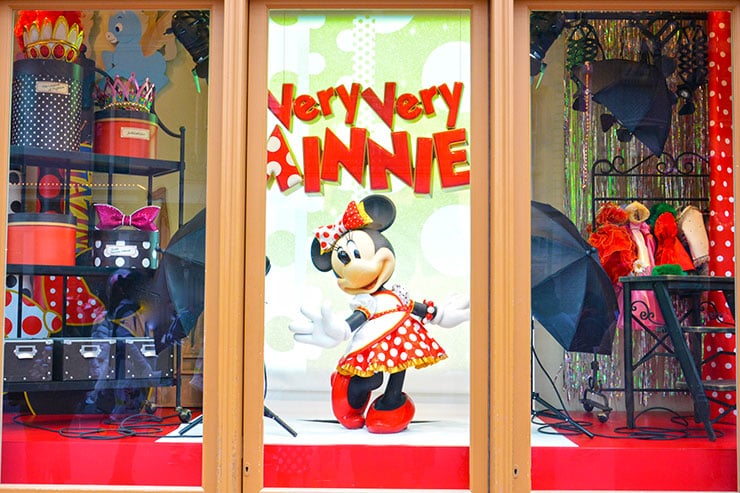 ワールドバザール最大のショップ、グランドエンポーリアムのショーウィンドウには、「ベリー・ベリー・ミニー!」のコスチュームで撮影中のミニーマウスの姿がありました。
