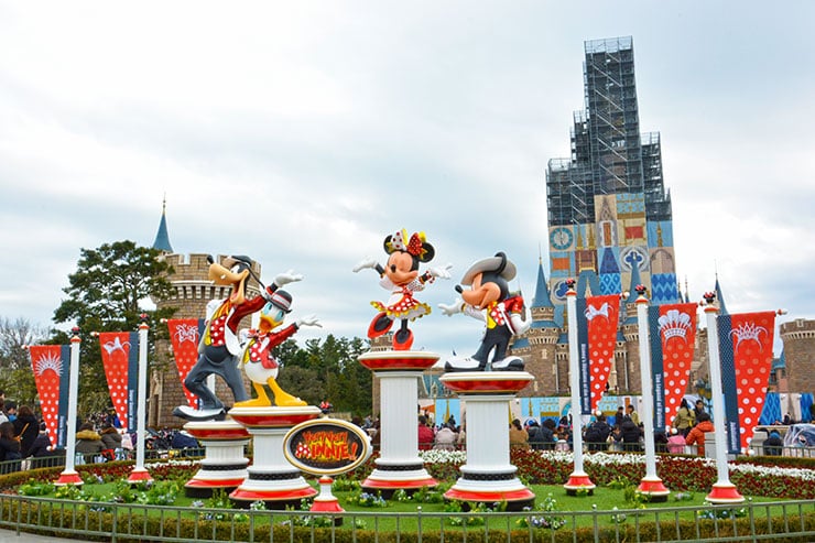 イベントのコスチュームを着たミニーマウスを中心に、ミッキーマウス、ドナルドダック、グーフィーが並び、その後ろには過去のショーがモチーフとなっているバナーが立ててありました。