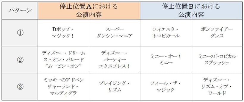 パターン① A:Dポップ・マジック! / スーパーダンシン・マニア B:フィエスタ・トロピカール / ボンファイアーダンス パターン② A:ディズニー・ドリームス・オン・パレード“ムービン・オン” / ディズニー・パーティーエクスプレス! B:ミニー・オー!ミニー / ・ミニーのトロピカルスプラッシュ パターン③ A:ミッキーのアドベンチャーランド・マルディグラ / ブレイジング・リズム B:フィール・ザ・マジック / ディズニー・リズム・オブ・ワールド
