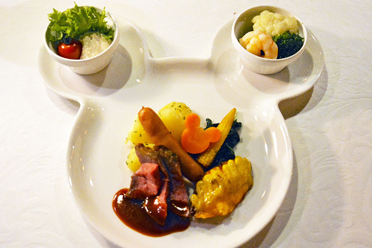 - ミッキープレート(ツナサラダ、ローストビーフ、サーモンのオーブン焼き、ソーセージ、ヤングコーン、ホウレン草のソテー、シュリンプ、ブロッコリー、カリフラワー)