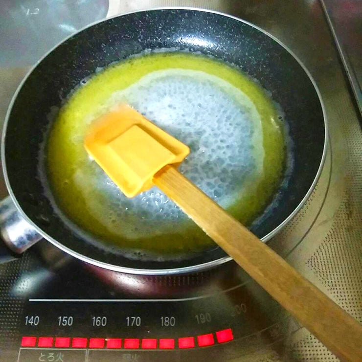 ① 水240ccを深めのフライパンや鍋に入れて中火で加熱し、バター大さじ8(120g)、塩小さじ4分の1(1.5g)、シナモン小さじ4分の1(1.5g)を加える ※シナモンは全量ではなく、用意した分量のうちの3分の1を使うので注意!