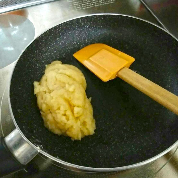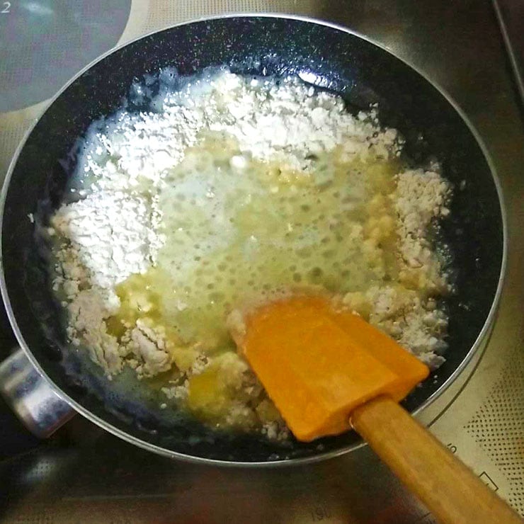 ② 沸騰したら弱火にして中力粉150gを投入し、ボール状に丸められるようになるまでヘラなどで混ぜる ※ダマをつぶしながらまぜていきます