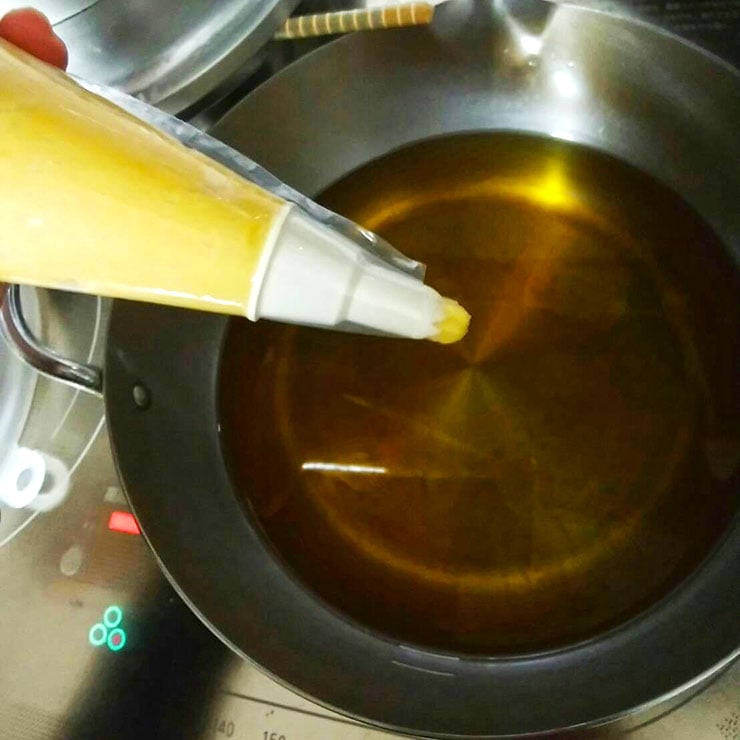 ⑦ 熱した油に生地を絞り出し、スプーンなどを使って切り落としていく ※ 油はね注意!!怖い方はあらかじめクッキングシートの上に絞り出しておくと良いと思います
