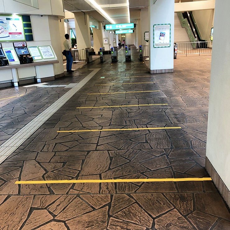リゾートラインも混雑時は入場規制を行うようで、改札前にも黄色いラインが貼ってありました。