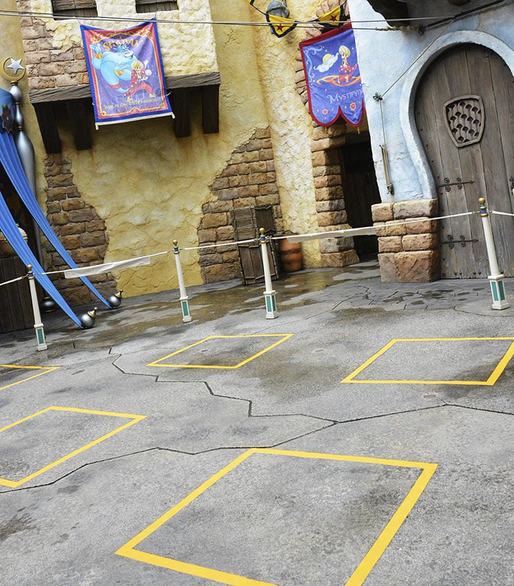 ソーシャルディスタンスで前後の人と距離を開けて並ぶため、「ソアリン」の待機列はこのように延びています。