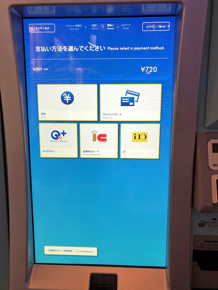 支払い方法は現金だけでなく、クレジットカード・クイックペイ・交通系ICカード・iDから選べました。
