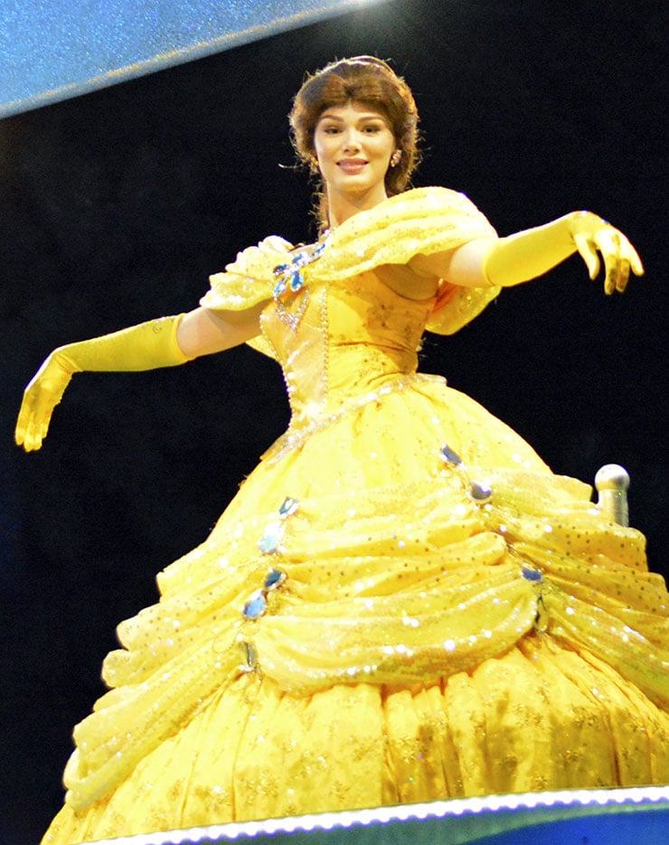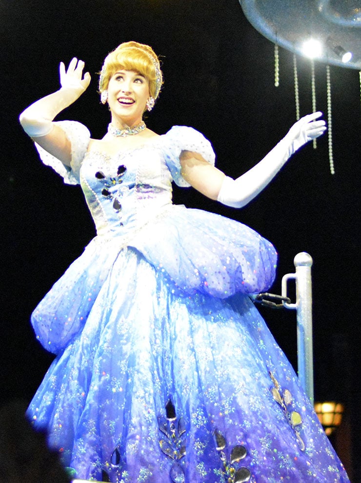 光のマジックによって様々な色に変化するフロートに乗って最初にやってくるのは、『眠れる森の美女』に登場する3人の妖精、フローラ・フォーナ・メリーウェザーです。