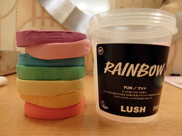 つかったのは、LUSHのレインボーファンというもので、それぞれの色で香りの違う粘土のようなものをちぎって浴槽に入れます。