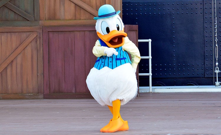 登場キャラクターは“当日のお楽しみ”となっていますが、2021年1月現在、アメリカンウォーターフロントのコスチュームのドナルドダックが登場しています。