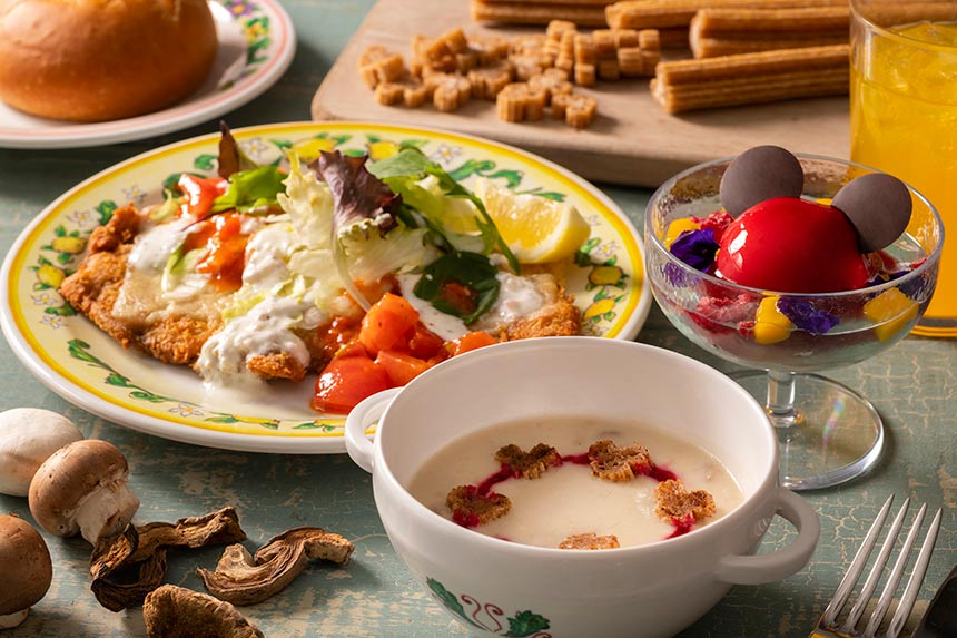 スープのクルトンは、なんとパークで人気のミッキーチュロス!